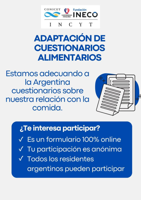 Como parte de un estudio sobre alimentación y funciones cognitivas estamos adecuando a la Argentina cuestionarios sobre nuestra relación con la comida. Te invitamos a participar completando cuestionarios breves online. Tu colaboración es muy importante.